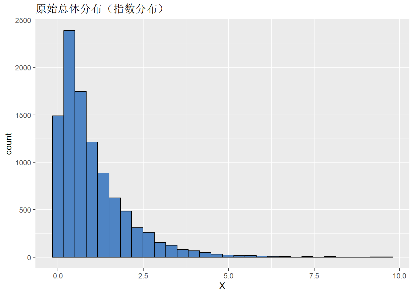 labs(title="原始总体分布(指数分布)", x="X", y="count")